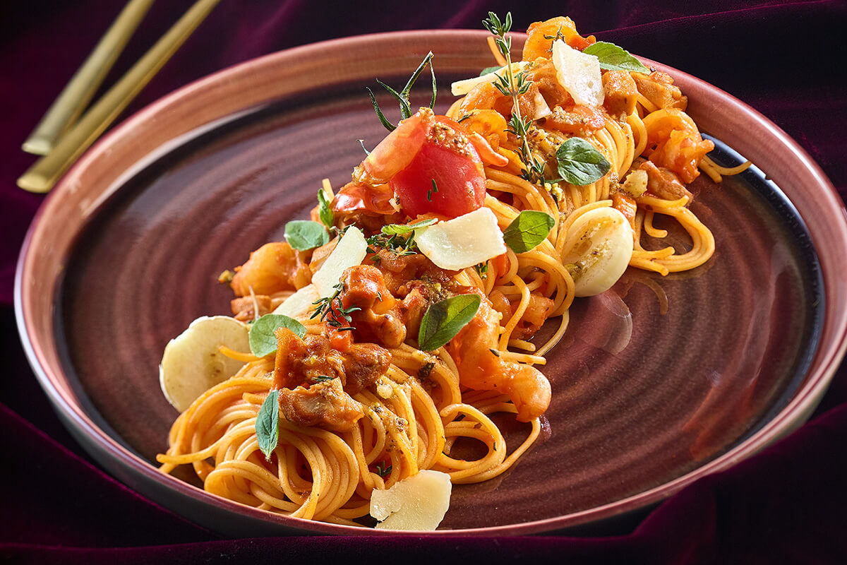 „Un preparat tipic mediteraneean din categoria mari e monti (mare și munte), care îmbină în mod creativ ingrediente precum creveții, puiul, roșiile, spaghetele, usturoiul, sosul de pesto și ierburile aromatice. Folosirea împreună a creveților și puiului este poate inedită pentru noi, dar merită, cu siguranță, încercată!” Chef Marcian Vodnar