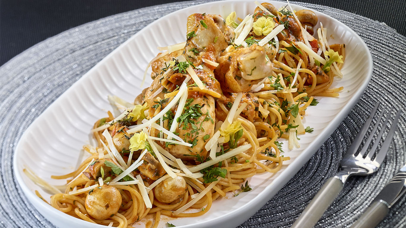 Acest Sauvignon Blanc ușor exotic, cu note tipice de ierburi aromatice, este în acord perfect cu sosul proaspăt de tomate și pulpele de pui suculente, transformând o rețetă simplă într-un preparat elegant, potrivit și pentru o ocazie mai specială.