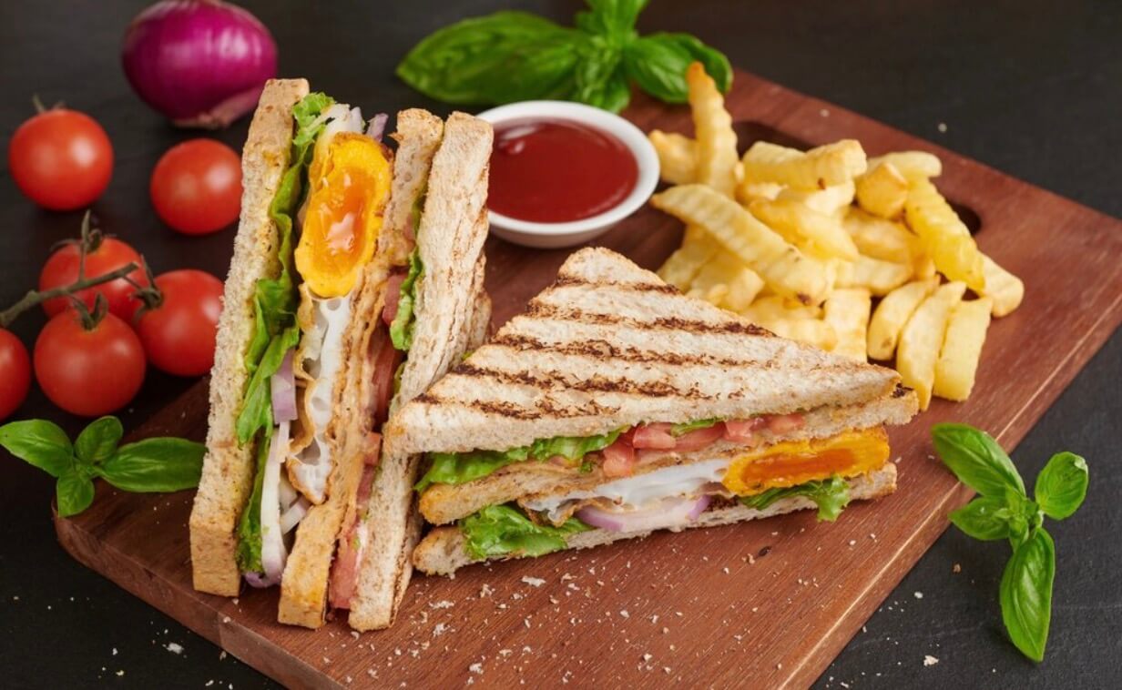 Răsfață-te la prânz cu un preparat ușor de preparat și absolut delicios: sandwich club cu pui. Este un tip de sandwich bogat în proteine, cu pui la grătar acoperit cu bacon crocant și salată suculentă. În plus, partea frumoasă este că durează doar 10 minute!