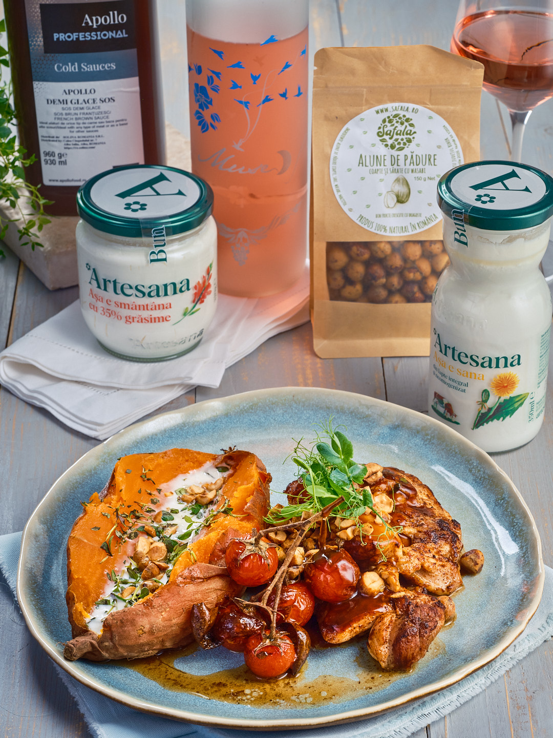 Pulpe de pui cu piele Fragedo marinate în sana, cu cartof dulce la cuptor, smântână aromatizată cu cimbrișor, sos demiglace, roșii cherry prăjite și alune de pădure cu gust de wasabi