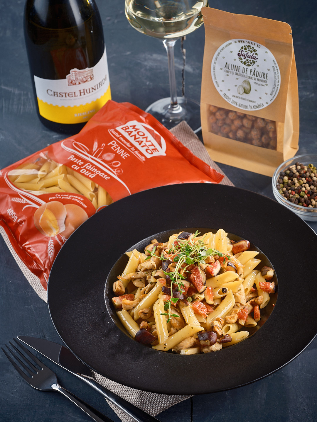 Penne cu ragù alb din piept de pui, alune de pădure cu ierburi de Provence și smochine