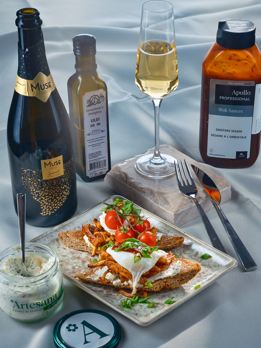 Aperitivul perfect trebuie întotdeauna însoțit de un vin proaspăt, revigorant și intens fructat. Spumantul Muse Stars este alegerea perfectă, datorită mineralității pronunțate și a perlajului fin, ce complimentează perfect mixul bruschetelor, garantând savoarea gustului.